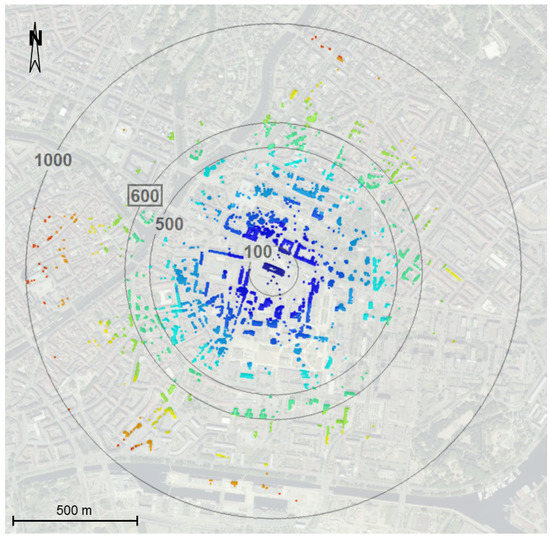In order to assess the maximal measurement range announced by the manufacturer, an outdoor experiment was carried out. To ensure a large visibility, the tests were performed from a building roof surrounded by other buildings in the city center of Strasbourg, France. A 360° band-shaped point cloud was acquired from the roof with a low point density to keep a moderate scanning duration. Figure 2 shows a top view of the acquired point cloud. Centered on the scanner location which is known, circles have been drawn with rays representing different acquisition ranges. The color codification represents the points divided per 100 m range. In Table 5, the number of points belonging to each 100 m portion is reported, as well as the percentage it represents with respect to the number of points of the whole point cloud.