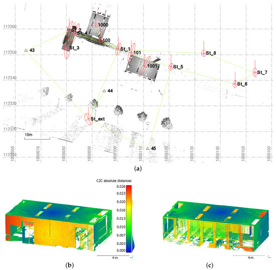 Network adjustment has been recomputed using another software dedicated to the adjustment of geodetic networks (Covadis, Geomedia). Since the deviations between the final coordinates adjusted by this means and through TBC never exceed 1 cm, the results obtained thanks to the manufacturer software can be validated. Besides, network adjustment has a direct influence on the coordinates of point clouds contained within the project. To illustrate this influence, the whole point cloud acquired during the project has been exported twice, first as raw data and then after network adjustment. The distances computed between both point clouds focusing on one room are shown from two opposite points of view in Figure 3b,c. The cloud-to-cloud comparison has been performed using the dedicated free software CloudCompare [36]. Deviations no larger than 2.5 cm and with a mean value of about 5 mm are observed. It also appears that the larger deviations are predominantly visible on two opposite faces of the room, which means that the offset between both datasets mainly occurs along one direction. Their order of magnitude near to 1 cm almost corresponds to the deviation between station coordinates before and after adjustment. These deviations caused by the polar measurement of successive points within a traverse attest to the adjustment influence on scanning data.