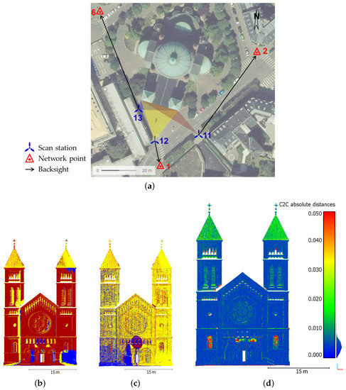 (a) Overview of the area around church facade; (b) Three point clouds acquired on the surveyed church facade without alignment refinement; (c) Point clouds finely registered after Iterative Closest Point (ICP); (d) Cloud-to-cloud comparison between FARO Focus3D and Trimble SX10 point clouds of the facade. Deviations (unit: m) are projected on SX10 point cloud.