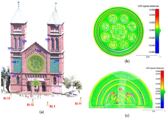 (a) Overview of the facade containing control points and locations of the areas selected for finer analyses; (b,c) Cloud-to-mesh comparisons performed on detailed areas between the SX10 point cloud and meshed parts of FARO Focus3D point cloud: the rose window (b) and the tympanum (c). Deviations are in meters and projected on SX10 point cloud.