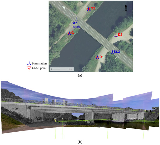 The second scanning project which is presented in this article involves a road bridge located near the Franco-German border in the Alsace region, France. A network of known points has been previously built in this area by determining the coordinates of some points with a GNSS receiver. Figure 6a presents an overview of the area containing reference points used during the project. This figure also shows that the four reference points below the bridge on the riverbank have been used as scanning stations. For each of these stations, the Trimble SX10 was set up on one considered reference point and oriented on the three others. To complete the point cloud of the bridge, two further scanning stations have been set up, under the bridge deck on one side and on the deck on the other. The new station coordinates have been determined through resection based each time on three visible references. Thus each of the six acquired point clouds is known in the coordinate system applied in this study, so that the whole scanning project is directly georeferenced. A station view from TBC software is presented in Figure 6b. On such a view, the user can visualize the georeferenced point clouds and pictures acquired from the selected station, as well as references and surveyed points.