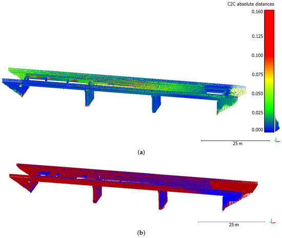 (a) Cloud-to-cloud comparison between Leica C10 and Trimble SX10 directly georeferenced point clouds of the bridge. Deviations (in m) are projected on SX10 point cloud; (b) Overview of both Leica C10 (in red) and Trimble SX10 (in blue) point clouds displayed together.