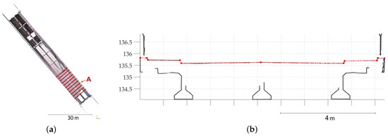 (a) Top view of the bridge point cloud with locations of the investigated sections (red lines); (b) Section A performed in Trimble SX10 point cloud and displayed together with the tacheometric profile data (in red).