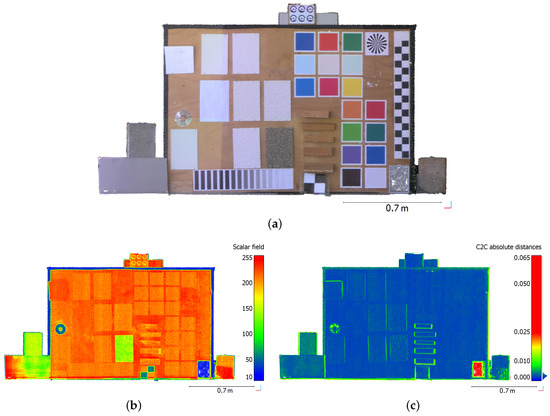 (a) Trimble SX10 colorized point cloud of a board composed of various color and material samples; (b) Visualization of intensity values returned by the laser scanner; (c) Cloud-to-cloud comparison between FARO Focus3D and Trimble SX10 point clouds of the same board. Deviations (unit: m) are projected on SX10 point cloud.
