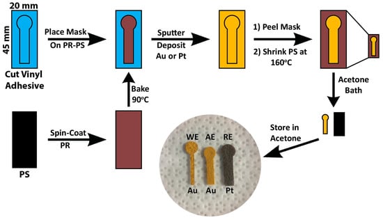 The structured electrodes used within the microfluidic device were fabricated using a vinyl stencil lift-off and pre-stressed polystyrene (PS) shrinking method previously described (Figure 1) [20]. Briefly, the PS sheets (Shrink Film, Graphix, Maple Heights, OH, USA) were cut to the desired shape using a blade cutter (ROBOPro CE5000-40-CRP, Graphtec America Inc., Irvine, CA, USA) followed by a 3-step wash with isopropyl alcohol, ethanol, and 18.2 MΩ water under constant agitation at 60 rpm, and dried under a nitrogen (N2) stream. The clean PS sheets were spin-coated with a positive-tone photoresist (PR, Shipley 1818, Marlborough, MA, USA) layer with a 1.8 μm nominal thickness. The PR-coated PS sheets were then baked on a hot plate at 90 °C for 3 min to remove residual solvent. The self-adhesive vinyl (FDC-4300, FDC graphics films, South Bend, IN, USA) shadow masks were also patterned using the blade cutter to the specific electrode dimensions for the working (WE) auxiliary (AE) and reference electrodes (RE), which were set to 10.8 mm × 1.6 mm × 4.8 mm, 10.8 mm × 3.0 mm × 4.8 mm, and 10.8 mm × 3.0 mm × 4.8 mm (length × width × pad diameter), respectively (Figure S1). The adhesive vinyl masks were then transferred onto the clean PS and served as stencils during the metal deposition process. Gold (99.999% purity, LTS Chemical Inc., Chestnut Ridge, NY, USA) and platinum were deposited using a Torr Compact Research Coater CRC-600 manual planar magnetron sputtering system (Torr International, New Windsor, NY, USA) at deposition rates of ~1 Å/s (100 nm) and ~0.1 Å/s (150 nm), respectively. Following this step, the vinyl stencils were lifted off and the PS sheets were placed in an oven heated at 160 °C, which shrunk the PS substrates to ~16% of their original size by area [15,20]. The structured metal films were lifted off from the PS by dissolving the PR in an acetone bath under constant agitation at 80 rpm for 30 min. Once the electrodes were lifted off from the PS, they were stored in acetone until further use.