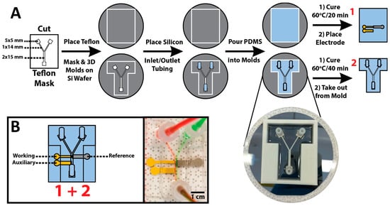 Bench-top microfabrication process for making the all-PDMS on-chip μF electrochemical biosensors. (A) A Teflon adhesive μF channel mold was cut and placed inside a 3D printed device mold on top of a Si-wafer to ensure surface flatness. Silicon tubing was placed at the inlet/outlet positions, and PDMS was poured into the mold until full. The bottom layer (1) was partially cured at 60 °C for 20 min followed by placement of the three electrodes. The top layer (2) was cured at 60 °C for 40 min and removed from its mold. (B) PDMS Layers (1) and (2) were plasma treated for 30 s, bonded, and allowed to fully cure at 60 °C for 1 h.