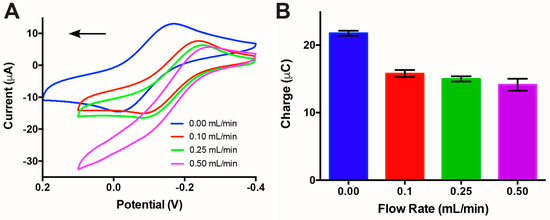Assessment of the impact of flow rate on charge transfer efficiency. The cyclic voltammetry experiments were performed using a 5 mM K4[Fe(CN)6] working solution at a 0.10 V/s scan rate. (A) Cyclic voltammograms showing changes in reduction and oxidation peaks and down-right shifting of the voltammograms as flow rate increased from 0 to 0.5 mL/min with a positive initial scan direction as indicated by the arrow. (B) Quantification of the total charge transfer in the cathodic peak for the different flow rates. Between flow rates of 0.1 and 0.5 mL/min, there is no statistical difference in charge transfer efficiency.