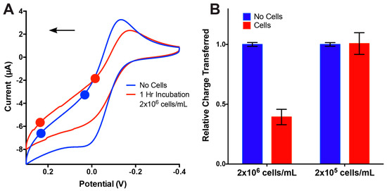 Fibroblast sensing in 5 mM K4[Fe(CN)6] solution at a 0.1 mL/min flow rate. (A) Cyclic voltammogram of the detection of murine 3T3 fibroblast cells vs. control electrode. (B) Relative charge transferred by the working electrode during the detection of murine 3T3 fibroblast cell vs. the control electrode. All error bars represent the standard error of the mean, n = 3.