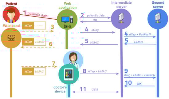 As aforementioned, when a patient arrives at a hospital, the first step is the identification through his/her credentials. After that, in the proposal, an NFC wristband is assigned to him/her so that each patient is identified through an HMAC generated by the intermediate server by using the physical identifier of the wristband and the patient record number. If a patient does not have a medical record in the system, it is automatically created with some basic fields, such as name, age, country, etc.