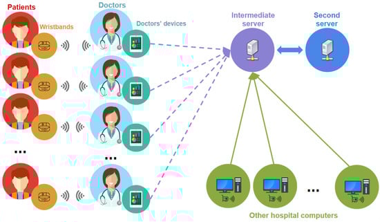 As seen in Figure 3, on the one hand, there are different devices assigned to doctors, which are smartphones or tablets with NFC reader and Wi-Fi. On the other hand, each patient has an NFC wristband. The intermediate server is the controller of the communication between the medical staff and the PKG. In particular, the intermediate server has a public Application Programming Interface (API) for doctors’ communication and other hospital computers and a private API for communication with the PKG. Finally, the PKG is in charge of the authentication and verification of each communication. This is why server keys are stored in the PKG.