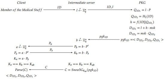 Figure 4. Setup phase. - Extract: The private group key for each member of the medical staff based on its is generated. The intermediate server generates a random number l, and sends it together with to the second server. Then, the PKG computes different values to obtain a private group key , which is calculated taking into account the master private key . Finally, in the intermediate server, a secure channel is created based on an ECDH to share the private information with the doctor. A session key is generated to encrypt the information, obtaining an encrypted message C with a Snow 3G stream cipher algorithm [41] (see Figure 5).