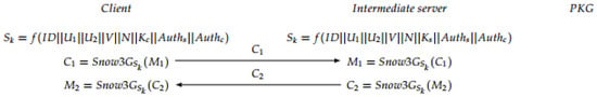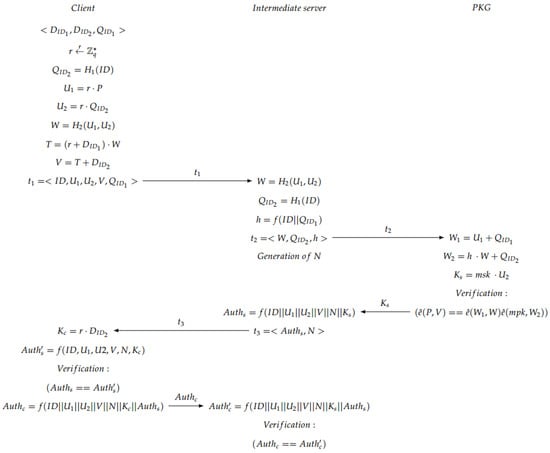 Figure 6. Mutual authentication phase.Note that in the verification step carried out in the second server, the PKG checks whether the condition is fulfilled in order to accept the communication. The justification of that condition is explained below:= = = = = = = = = - Session Key Generation: When both server and client have been mutually authenticated, the session key (see Figure 7) is generated, at the same time, on the client side and on the server side. Afterwards, the exchanged messages are encrypted using the produced session key. In particular, the communication exchange between server and doctor is performed using the stream cipher SNOW 3G [42] using the obtained session key.