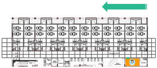 For the simulations, the map of the floor was divided into four parts so that each one was run in a quarter of the map. A grid map of each part was generated to evaluate the route that doctors follow to visit each patient (see Figure 11). The best route in the current system consists of visiting patients located in adjoining rooms. In the simulation, it is assumed that there are two patients in each room.