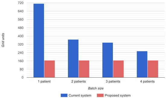 The time required for the doctor’s route depends on the number of patients that a doctor can visit at once, that is to say, the size of the batches of patients that he/she has to visit before going back to the documentation area. In the proposed system, the time required for the doctor’s route is always constant because it is assumed that he/she does not have to go to the documentation area. In Figure 12, a representation of the grid units covered by the physician can be observed. Blue bars reflect the grids covered in the current system while red ones show those required by the proposed system.