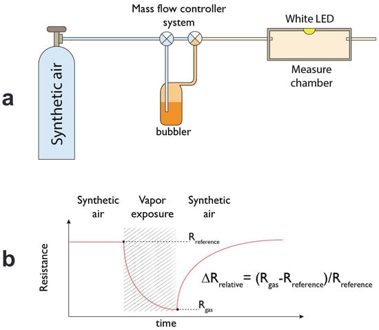 (a) Scheme of the measurement setup; (b) The sensor response is calculated as the relative change of resistance measured in reference and during the addition of volatile compound.