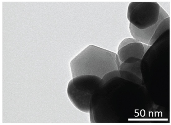 Figure 3 shows a TEM picture of porphyrins-coated ZnO nanoparticles. As previously observed with nanorods [9], the addition of porphyrins to the ZnO precursor solution strongly affects the final morphology of the nanostructure. The particles diameter is on the order of 50 nm, which is smaller than that obtained without porphyrins [13]; furthermore, the particles are characterized by rounded borders and irregular shapes.