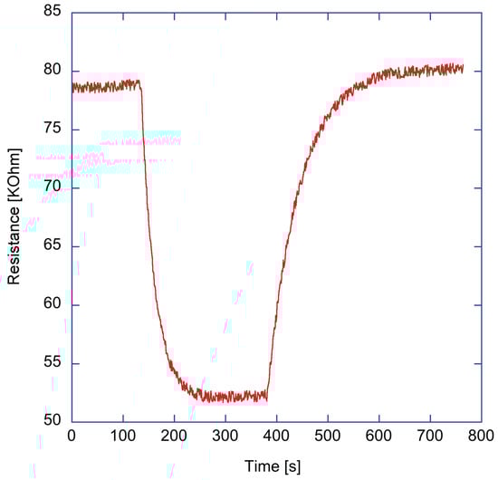 During the gas measurements, the sensors were always kept under the constant illumination of the white LED. The resistances in this condition were in the range of tens of K. As an example, Figure 4 shows the resistance change of ZnTPPCOOH sensor exposed to 2% of triethylamine vapors. A good recovery of the baseline can be observed. As shown in Figure 2b, the sensor response is the ratio between the resistance change and the baseline value.