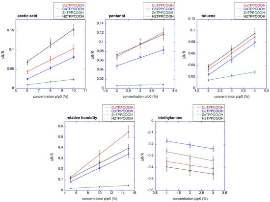 In all sensors, the absorption of triethylamine elicits a decrease of conductivity in all sensors, but the resistance increases for all the other volatile organic compounds (VOCs).