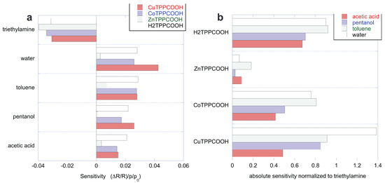 The sensitivity of the sensors to the five compounds is calculated as the derivative of the sensor response () with respect to the concentration (p/p0). All the sensitivities are compared in Figure 6a. As discussed above, the sensors are characterized by a common behavior with respect to the set of VOCs. Since the sensitivity to triethylamine is peculiar, it is interesting to evaluate the sensitivity to the other VOCs with respect to triethylamine. The ratio of sensitivity accounts for the selectivity of the sensor with respect to triethylamine. Figure 6b shows the sensitivity normalized to the absolute value of the sensitivity to triethylamine. Except for the case of the sensitivity of CuTPPCOOH to water, the ratio of sensitivities is always smaller than one. The smallest normalized sensitivities are found in ZnTPPCOOH, which is the more selective of the four sensors. It is important to observe that each sensor shows a different pattern of relative sensitivity. This feature is particularly important for sensor arrays, because the sensor’s capability to discriminate compounds relies on these differences.