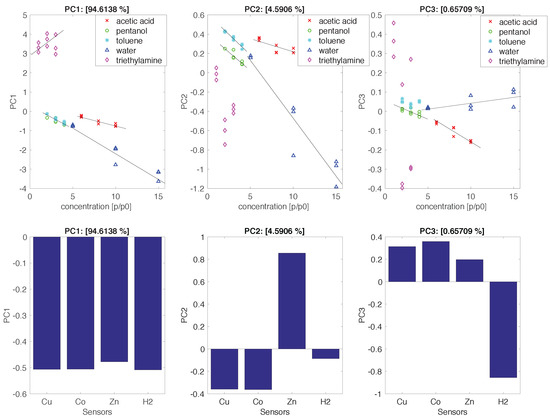PCA was applied to the whole set of measurements, where each concentration was measured three times. In this way, PCA results enable an appreciation of the separation of the different VOCs with respect to the dispersion of sensor signals.