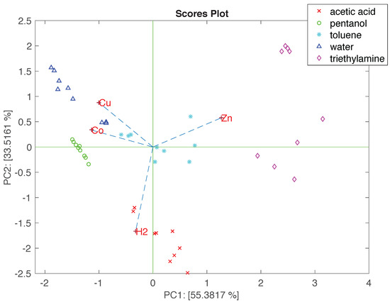 PCA was applied to the matrix of normalized data. Figure 8 shows the PCA results as a bi-plot where scores and loadings are contemporaneously displayed. Such a plot allows for studying—in addition to the clustering—the relationship between the data and the sensors. In Figure 8, the data related to each compound cluster together, disregarding the concentration. Due to the peculiar sensors responses, triethylamine is plotted aside. The loadings of ZnTPPCOOH—the most selective sensor—points towards the region where triethylamine is plotted. The other compounds are more gathered together, but without overlaps. CoTPPCOOH and CuTPPCOOH point toward pentanol and water. This is not surprising, considering that CuTPPCOOH shows the largest sensitivity to these compounds. Finally, H2TPPCOOH is oriented towards the acetic acid, in agreement with the fact that this is the sensor with the largest sensitivity to acetic acid.