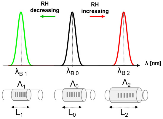 The image shows the lengths and the spatial periods of the gratings, as well as the Bragg wavelengths at three different RH values. The RH variation induces the volumetric expansion (when RH increases) or contraction (when RH decreases) of the hygroscopic material, resulting in the increase of both its length (L2) and of the spatial period of the grating (Λ2) when RH increases, or in the decrease of both its length (L1) and of the spatial period of the grating (Λ1) when RH decreases.