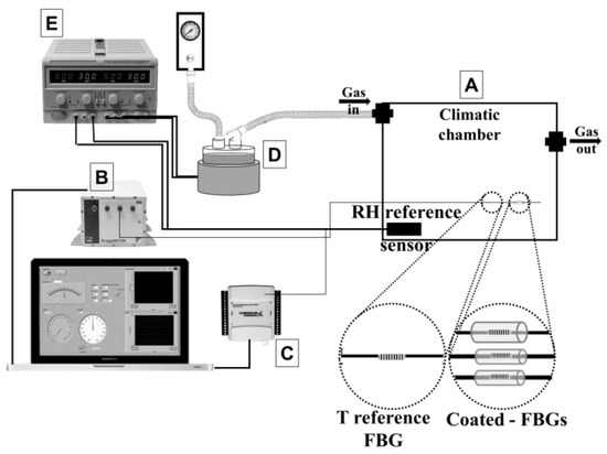 Experimental set-up: (A) climatic chamber; (B) fiber Bragg grating interrogator system; (C) data acquisition board (DAQ NI USB-6009); (D) heated wire humidifier; (E) DC power supply.