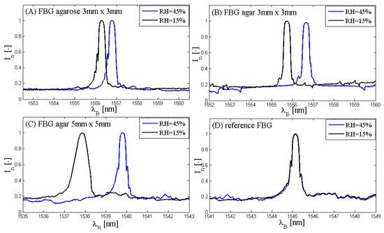 Spectra of the three fiber Bragg grating (FBG)-coated sensors and of the reference FBG sensor at different RH values: (A) spectra of the agarose 3 mm × 3 mm-coated FBG at RH = 15% (black line) and RH = 45% (blue line); (B) spectra of the agar 3 mm × 3 mm-coated FBG at RH = 15% (black line) and RH = 45% (blue line); (C) spectra of the agar 5 mm × 5 mm-coated FBG at RH = 15% (black line) and RH = 45% (blue line); (D) spectra of the reference FBG at RH = 15% (black line) and RH = 45% (blue line).