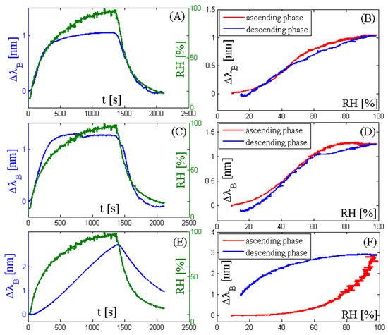 Figure 5A shows that the maximum ΔλB is experienced at the end of the ascending phase; this is the result of a slight temperature increment of the gas within the climatic chamber during this phase. Indeed, the gas passes through the humidification chamber of the HWH, where it absorbs vapor and also experiences a slight temperature increment. Considering the thermal sensitivity of the sensor (i.e., 0.01 nm∙°C−1), the maximum temperature increment experienced within the climate chamber is about 1 °C. Figure 5B provides information about the ΔλB during the two phases, but it does not represent the sensitivity of this sensor to RH, because the ΔλB is caused by the temperature increment. Finally, we want to point out that this temperature increment can be considered negligible in the analysis of the response of the three RH sensors because the ΔλB caused by RH changes (Figure 4) is much bigger (two orders of magnitude) than the one caused by the temperature change (Figure 5).