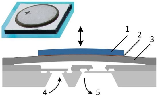 Micropump and its cross-section: (1) piezo; (2) adhesive; (3) actuation diaphragm; (4) inlet valve; and (5) outlet valve.