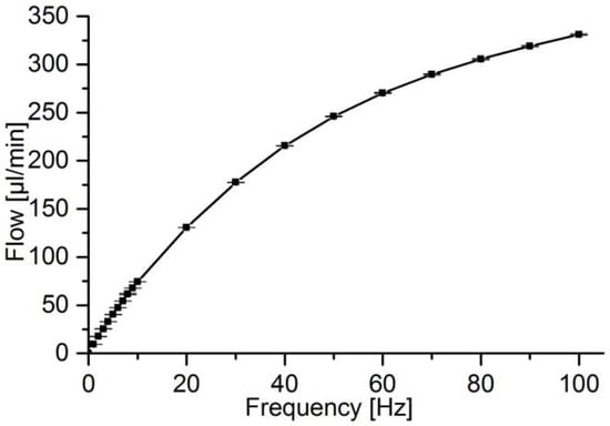 By smoothing the pulsatile micropump flow with large capacitances (PSEs), holding multiple stroke volumes with low pressure changes, a continuous flow rate can achieved. Sensors with lower velocity can be employed behind the smoothing elements to measure continuous flow. A range of flow rate with a high accuracy can be chosen, being low flow rates for thermal calorimeters or high flows for DPB based sensors. Another advantage over transient pulsatile measurements is the potential direct use of the output parameter for control purposes requiring no or less further processing. However, implementing PSEs for minimal damping for a certain flow rate is challenging. Changing the frequency will result in more pulsatility and less accuracy. At the single stroke based control mode, a higher range of driving frequency can be employed with defined accuracy limits. Dosing defined volumes with several strokes can be done with a very high accuracy by adjusting the stroke volume after each cycle, leaving only the sensor accuracy and the last adjusted stroke as main sources for deviations (compare to Equation (4)). In general, capacitive damping has a big impact on flow, which is why it has to be limited to elastic capacitive damping by avoiding gas bubbles.