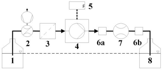 Generic liquid dosing system setup for stable continuous flow: (1) reservoir; (2) inline degasser; (3) filter; (4) micropump; (5) electronic driver; (6a,b) pressure smoothing element (PSE); (7) flow sensor; and (8) outlet reservoir.