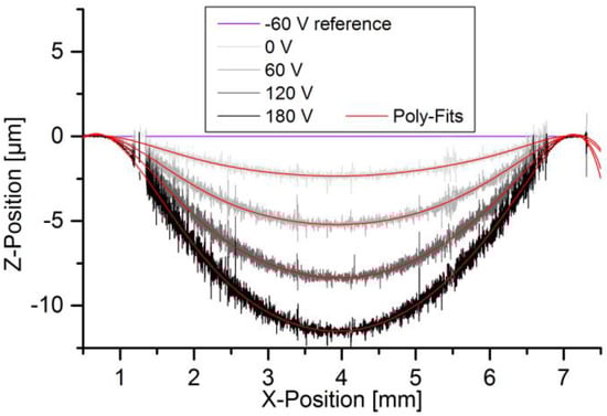 the volume per deflection is constant within the full deflection range of the micropump. The measured relative line displacement of the actuator, as shown in Figure 7, is used to calculate this ratio by integrating the line fit over half a revolution after shifting the line center to x = 0.