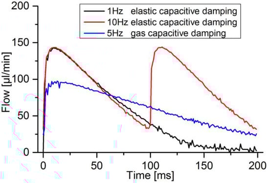To investigate the magnitude of gas capacitive and elastic capacitive damping on the flow, a perfectly filled fluidic path with as little elastic damping as possible was set up together with a DPB flow sensor. The elastic damping between pump and sensor lead to finished flow pulses after 200 ms, driven at 1 Hz (Figure 8). At 10 Hz, leaving 50 ms for the pump mode and 100 ms for the whole cycle, the pulse was not able to finish completely. After introducing a bubble in between pump and sensor, the flow was measured at 5 Hz meaning the pump stroke is limited to 100 ms, the full cycle to 200 ms. At pure elastic damping, the charged capacitance only results in minor deviations of flow curves, while strong smoothing occurs at gas capacitive damping