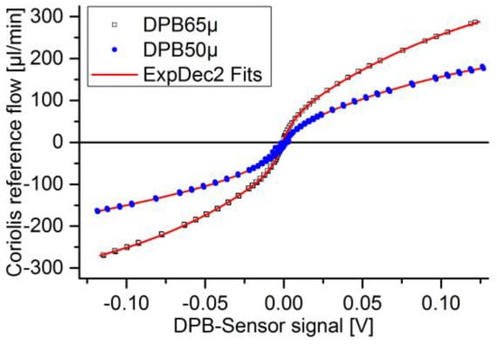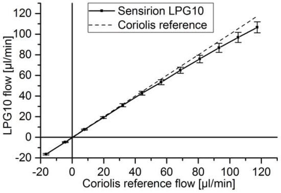Static calibration measurements with the same reference flow sensor were taken out to establish comparable flow values Section 2.2.1 and to describe the achievable accuracy in static operation. For the DPB sensor a bidirectional static calibration curve was recorded (Figure 9). The high steepness of the curve close to zero indicates low sensitivity. This leads to a high inaccuracy for low flow rates, but increasing accuracy for rising flow. The direct static calibration curve with sensor signal over flow cannot be determined, as we have to rely on a program output. However, from the literature, it is known that an exponential curve is to be expected for thermal calorimeter []. This correspond to the increasing deviations with rising flow rates as observable in Figure 10. The sensor behaves bidirectional, which is only indicated for a short range in the diagram.