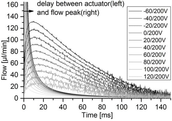 For the determination of sensor accuracy of pulsatile flow, the micropump was used to generate flow pulses of different height and volume by increasing the absolute voltage difference, according to the method in Section 2.2.2. The DPB sensor was addressed with the pump’s full voltage amplitude of 260 V. The thermal sensor was addressed with a maximum of 90 V. The actuator velocity peak is always reached within 1 ms. Comparing the sensor signal to the actuator velocity, as depicted in Figure 11, a delay of 8–14 ms from actuator to flow signal peak occurs, depending on the voltage level and for a perfectly filled fluidic path. The thermal sensor reaches its flow peaks at relatively stable 20 ms (Figure 12). DPB flow finishes after 150–200 ms, while calorimetric flow finishes after 100–150 ms.