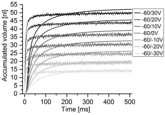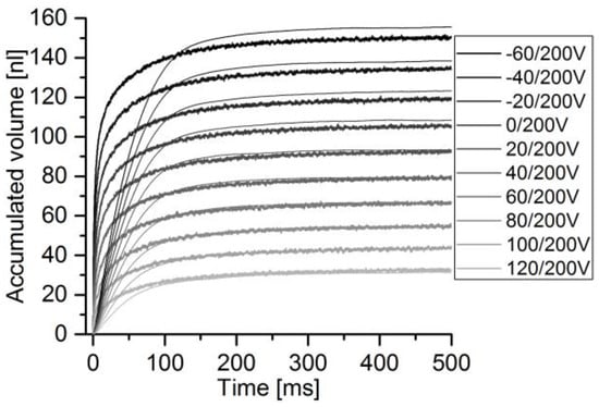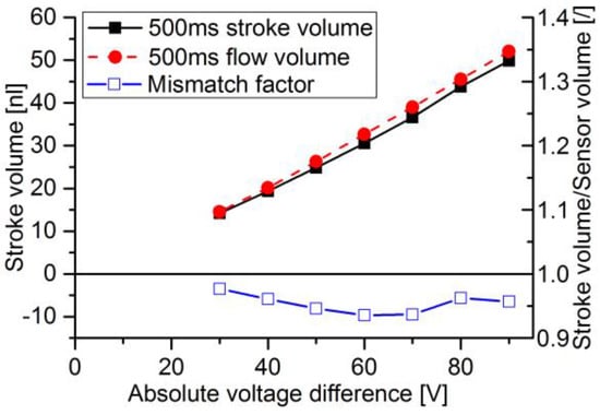 Stroke volume and sensor flow volume are compared at 500 ms, when the actuator is static and all pressure capacitances are equalized, hence no more liquid is flowing. For the two DPB sensors, deviations between the two volumes are shown in Figure 15. For voltage differences below 80 V, the signal was too noisy to evaluate. The sensors underestimate the flow up to voltage differences of 120 V, after that an overestimation of flow stabilizes at roughly 4–5%. The thermal flow sensor was subject to much higher flow rate changing rates. Stroke and flow volume are compared in Figure 16 and show a general overestimation of flow between 2–6.5%.