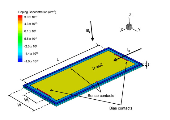 A macroscopic description of the Hall effect offers a useful theory, though with poor physical insights. On the contrary, quantum theory provides a deep understanding of the processes acting on each single carrier, albeit with an awkward mathematical description unsuitable for sensor design. In this context, numerical simulations of magnetic devices are a promising approach. Although the first research articles about technology-computer-aided-design (TCAD) appeared in the 1990s [5,6], commercial TCAD software coping with galvanomagnetic effects—that is, the full implementation of the Lorentz force—has only recently been made available [7].