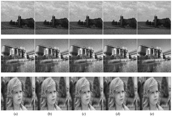 Figure 1 is the original image and simulated multi-frame degradation images. Figure 1a is the original images, and example frames with turbulence and noise are shown in Figure 1b–d (to save space, only three frames are shown). The comparison results based on the five algorithms are shown in Figure 2. In our algorithm, the parameters and were selected experimentally for visually acceptable results. Table 2 gives the results of our algorithm and those of the ML-EM [10], CPF-adaptive [11], RT-IEM [12], and VBBD-TV [9] methods, and the number of iterations for the four algorithms is 300. Our algorithm ranks on the top of the list, and the results demonstrate the superiority of our method.