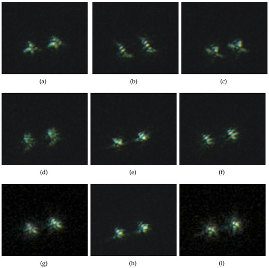 Nine frames of binary-star images by an AO system and their variances. (a) Frame 1 with variance ; (b) Frame 2 with variance ; (c) Frame 3 with variance ; (d) Frame 4 with variance ; (e) Frame 5 with variance ; (f) Frame 6 with variance ; (g) Frame 7 with variance ; (h) Frame 8 with variance ; (i) Frame 9 with variance .