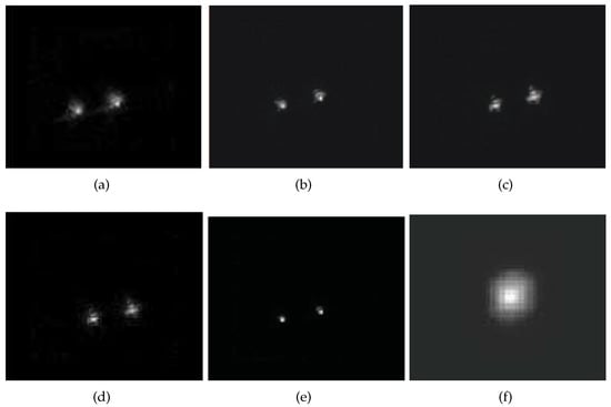 Moreover, the and measures of the best restored images by the five algorithms are compared in Figure 5. The measure versus the iteration number for the five algorithms on the binary-star AO images are plotted in Figure 5a. Figure 5b is the results for the five restoration algorithms. It can be seen from Figure 5b that our algorithm has values that are close to the diffraction limit of the AO system when applied to binary-star images. This shows that our restoration algorithm can effectively restore the degraded AO images.