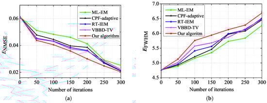 The comparison results of the restored images based on four algorithms (with 300 iterations). (a) by the ML-EM algorithm; (b) by the CPF-adaptive algorithm; (c) by the RT-IEM algorithm; (d) by the VBBD-TV algorithm; (e) by our algorithm with and .