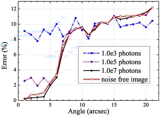 Sensitivity analysis is the study of how the uncertainty in the output of a model can be portioned to different sources of variation in the model inputs [31]. In order to evaluate the benefits of using the proposed PSF initial estimation, the computation of the sensitivity indices of a PSF model was performed. In an AO image restoration process, we initialize the restoration algorithm with a perfect PSF. In this work, extensive simulations are performed to test the behaviour of the proposed PSF estimation. In a realistic case, the degraded AO image is affected by the turbulence effect, the photon, and detector noise. We assume that the dominant noise is the photon noise. The simulation conditions are the followings: the simulation is performed on three different photon noise levels varying in: photons, photons, and photons; and the angle varies from 1 arcsec for the minimum value to 21 arcsec for the maximum value. Figure 6 shows the error on the estimation of the PSF model in the case of a noise free image, and in the cases of photon noises with , , and photons in the whole image, respectively. We plot in Figure 6 the errors which are given in percentages on the magnitude estimation of star images using an isoplanatic deconvolution process. In the case of an isoplanatic deconvolution, the PSF is constant in the whole field of view [21]. For a given noise level, a limit angle can be defined below when the error is lower than the noise error. The lower the noise level, the greater the limit angle (see Figure 6). For instance, the error becomes greater than the noise error in the case of photons for angle . This limit angle can be used to define an isoplanatic angle for our AO image restoration method.