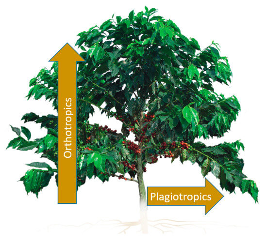 Technified coffee crops are densely planted areas with 5000 to 10,000 trees per hectare. Such crops can be found in tropical and subtropical zones of Asia, Oceania and the Americas. In the tropical zones of the Americas, there are mountainous regions, ranging from 1200 to 2000 meters above sea level, with specific climate and soil conditions which produce high-quality coffee. Coffee trees belong to the Rubiaceae family. They are known for their leaves, which grow in pairs, without divisions or smooth edges, their hermaphroditic flowers, and their fruit, which usually contains two seeds. The most noticeable morphological aspects are related to the two types of stems, Figure 1: (i) Orthotropics: the main stem grows vertically; (ii) Plagiotropics: the main, secondary, and tertiary branches grow horizontally. Coffee plants may grow up to 2.8 m in technified crops and, on average, produce 24 branches per year, although this varies according the climate and soil conditions of each crop. The production of coffee takes place on the plagiotropic branches, mainly in the middle third of the tree, which moves as the tree grows.