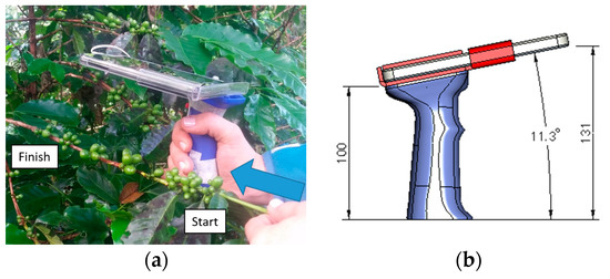 The images of a coffee branch were acquired as the mobile device moved in parallel over the branch, but only the fruits on one side of the branch were photographed (Figure 2a). With the aim of guaranteeing a constant distance between the camera and the branch, a holder was designed, with a handle, a secondary base to hold the device, and a pair of buttons to control focus and image acquisition (Figure 2b). An angle of 11.3° guaranteed that the user can see and control the branch focus before initiating the video recording. This angle could change as the video was recorded, since the user may have adjusted the mobile phone’s position, if the branch changed shape or curved. If the base of the holder is aligned with the longitudinal axis of the branch, a distance of between 80 and 150 mm is guaranteed between the camera and the branch, which is sufficient for information from one part of the branch to be contained in the image acquired by the mobile device.