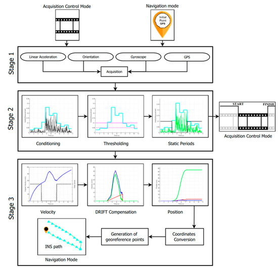 The algorithm described in Section 3 was calibrated for navigation mode, and evaluated for both modes. In navigation mode, the measurement of displacement on the terrain was carried out. This mode requires an additional adjustment (calibration) that involves the dynamics of the measurement at different aperture sizes. With the initial information from the GPS, the calibrated INS measurements and the coordinate conversion, georeferenced points were obtained, and adjusted to centimeters. Whether this georeferencing information depended on the rank of displacements and/or the velocities within the parcel was verified.