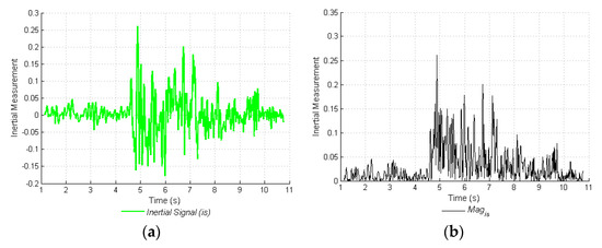 As shown in Figure 7a, the displacement generated by the INS shows small regressions at the end of each step. This is due to the fact that on many occasions, DRIFT compensation generated negative final velocities, as shown in Figure 7b. At no time were there regressions. This situation could have been generated because the median velocity of the movements was 44 cm·s−1 (between 45 cm·s−1 and 42 cm·s−1). At higher velocities, negative DRIFT compensations were not generated. For this reason, an adjustment or calibration was made for the position vector that shows the path. Normally, the path of the parcel was performed at these velocities, due to the complexity of movement in densely vegetated terrain.