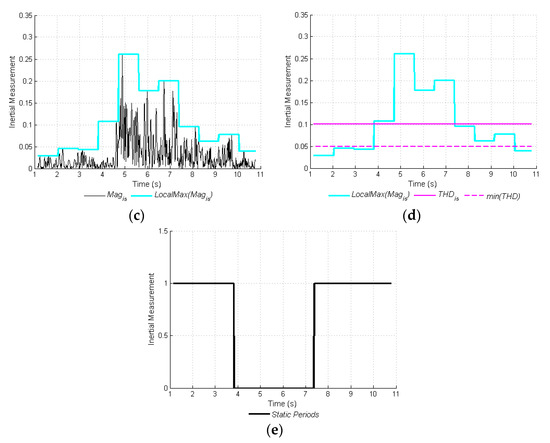 With relation to the type of acquired images, illumination was uncontrolled, flash was not activated, and there was a possibility of poor illumination conditions. For this reason, acquired images may be largely influenced by the absence of light and require the mobile device to move at low velocities in order to acquire adequate images. In this study, it was corroborated that, video frames acquired only at low velocities (Figure 11b), had sharp and coherent information. For medium and high velocities (Figure 11d,f, respectively), the information on glomeruli, fruits, and leaves disappeared due to blurriness. With the aim of finding the start and end of a given video recording, the movement period was defined as the moment when the displacement of the mobile device over the branch started until the moment it ended. In Figure 12a–c, the movement periods for low, medium, and high velocities, can be observed, respectively. With this information, the videos were edited and no frames were taken into account from when the device remained still. The start/end movement times were manually verified and compared with those generated by the proposed navigation system, and a correct identification of the start time was made 99% of the time and of the end time 97% of the time.