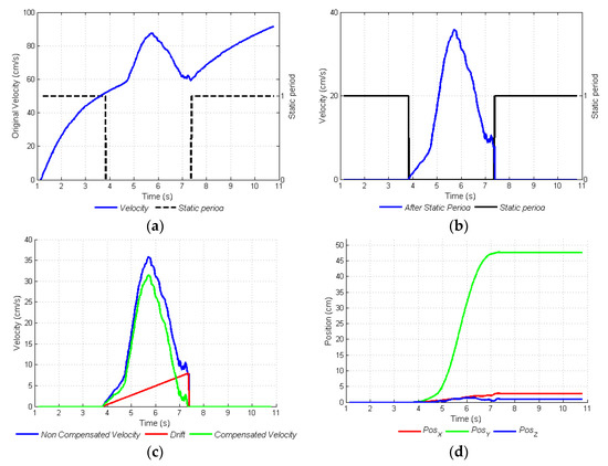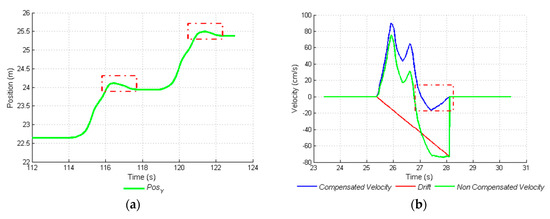 Effect of DRIFT compensation on calculated displacement. (a) Negative displacement marked in the boxes in two parts of the vector position; and (b) Negative compensated velocity due to the final velocity and DRIFT compensation.