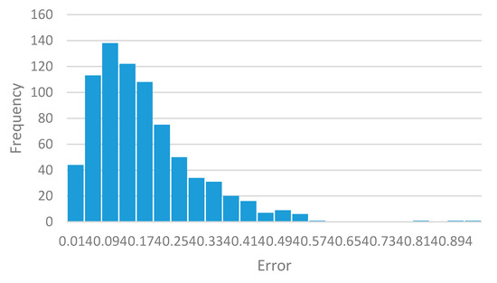 The system was validated with the three remaining calibrated signals with the regression coefficient found. The functioning of the algorithm was verified by means of a second linear regression analysis between the real displacement values and the measured and adjusted values. The result of this validation showed that the calibrated system had a regression coefficient of 1.0, this indicates that the INS did not overestimate or underestimate displacement values; it estimated them one by one with an R2 of 0.98. The mean relative error was found, as the absolute difference between real displacements and calculated displacements. The mean relative error of the measurement in this case was ±0.15 m, for displacements between 0.5 m and 3.75 m, clearly inferior to the one reported for the GPS (from ±2.5 m to ±5 m). The histogram presented in Figure 8 shows the absolute errors of INS and their dynamics.